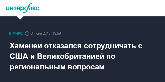 Москва. 3 июня. INTERFAX.RU - Руководитель Исламской республики Иран аятолла Али Хаменеи заявил, что Тегеран не намерен сотрудничать с США и Великобританией для урегулирования региональных проблем, сообщает в пятницу межарабский телеканал "Аль-Арабийя".