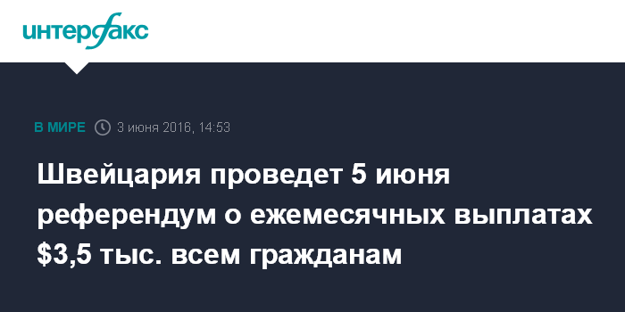 Москва. 3 июня. INTERFAX.RU - В воскресение 5 июня Швейцария проведет проведет референдум по вопросу безусловного основного дохода, сообщает news.com.au.