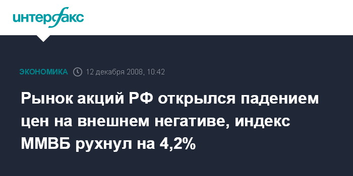 Москва. 12 декабря. INTERFAX.RU - Российский рынок акций открылся в пятницу падением цен всех blue chips на фоне падения нефти и мировых фондовых площадок после провалов переговоров в Сенате США по законопроекту о финансовой помощи автопрому, индекс ММВБ за минуту торгов рухнул на 4,2%.