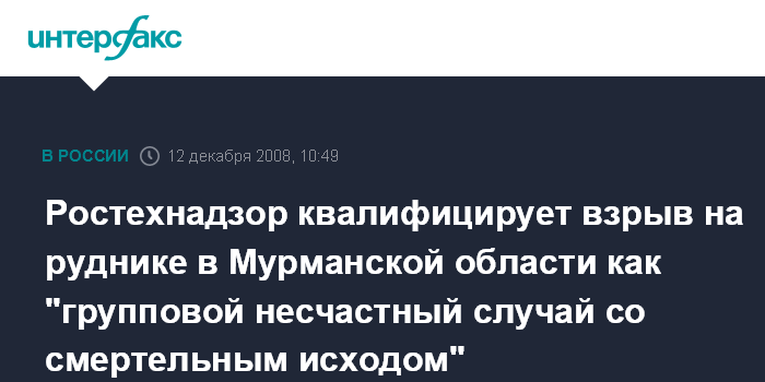 Ростехнадзор квалифицирует взрыв на руднике в Мурманской области как "групповой несчастный случай со смертельным исходом"