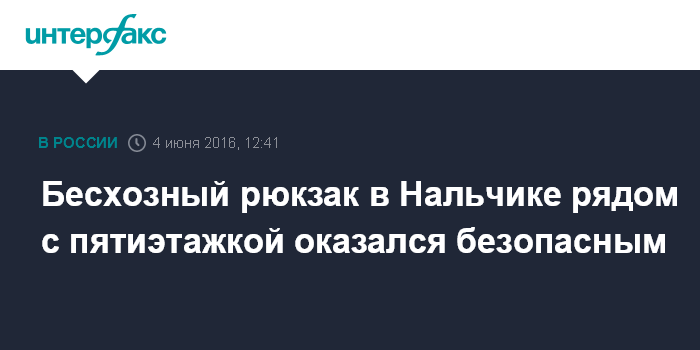 Москва. 4 июня. INTERFAX.RU - Взрывотехники убедились в безопасности рюкзака, забытого рядом с домом на улице Идарова в Нальчике, сообщил в субботу "Интерфаксу" источник в правоохранительных органах Кабардино-Балкарии.