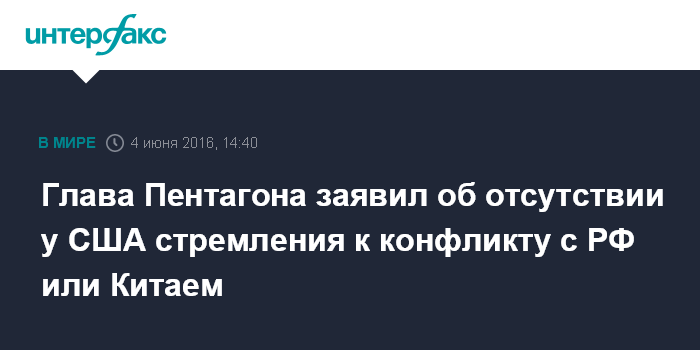 Москва. 4 июня. INTERFAX.RU - Шеф Пентагона Эштон Картер заявил в субботу, что США не хотят конфликта ни с Россией, и с Китаем.