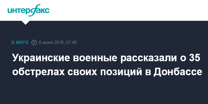 Москва. 6 июня. INTERFAX.RU - Позиции украинских военных в Донбассе за прошедшие сутки обстреливались 35 раз, сообщает пресс-центр силовой операции в Facebook. Согласно сообщению, на Мариупольском направлении зафиксировано 19 обстрелов, на Донецком - 13, на Луганском - три.