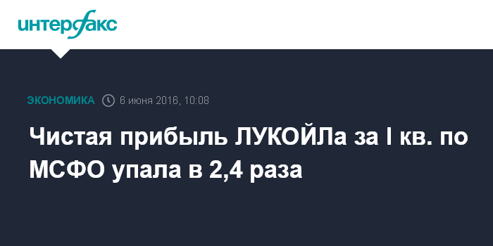 Москва. 6 июня. INTERFAX.RU - Чистая прибыль "ЛУКОЙЛа" за первый квартал 2016 года по МСФО составила 42,8 млрд рублей по сравнению 104 млрд рублей годом ранее (тогда компания публиковала результаты по стандартам US GAAP), сообщила НК.