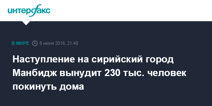 Москва. 6 июня. INTERFAX.RU - Операция оппозиционных "Сил демократической Сирии" (СДС) по освобождению от ИГ (запрещена в РФ) города Манбидж, вынудила уже 20 тысяч человек покинуть места проживания, сообщило в понедельник Управление по координации гуманитарных вопросов ООН (УКГВ).