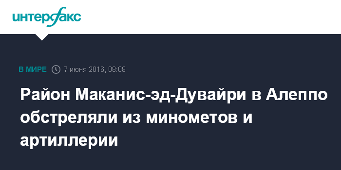 Москва. 7 июня. INTERFAX.RU - Боевики в ночь на вторник атаковали район Маканис-эд-Дувайри в городе Алеппо, сообщил журналистам представитель российского центра по примирению враждующих сторон на территории Сирии.
