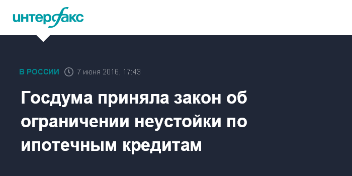 Москва. 7 июня. INTERFAX.RU - Госдума во вторник приняла во втором и третьем чтении законопроект, который ограничивает размер неустойки за неисполнение или ненадлежащее исполнение ипотечного кредитного договора физическими лицами.