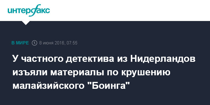 Москва. 8 июня. INTERFAX.RU - Швейцарские власти изъяли документы по делу о крушении "Боинга-777" компании Malaysia Airlines у частного детектива из Нидерландов, сообщила голландская газета De Telegraaf.
