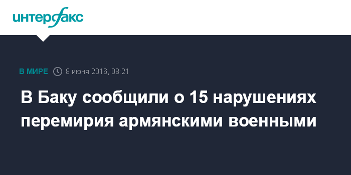 Москва. 8 июня. INTERFAX.RU - Армянские военные нарушили за минувшие сутки режим прекращения огня на линии соприкосновения вооруженных сил 15 раз, сообщает пресс-служба Министерства обороны Азербайджана.