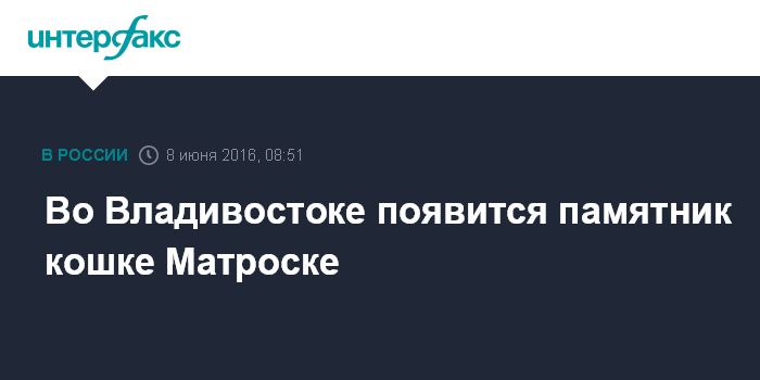Москва. 8 июня. INTERFAX.RU - Памятник знаменитой кошке Матроске, прославившейся обедом на 63 тыс. рублей в аэропорту Владивостока и ставшей впоследствии талисманом ХК "Адмирал", планируют установить у арены клуба.