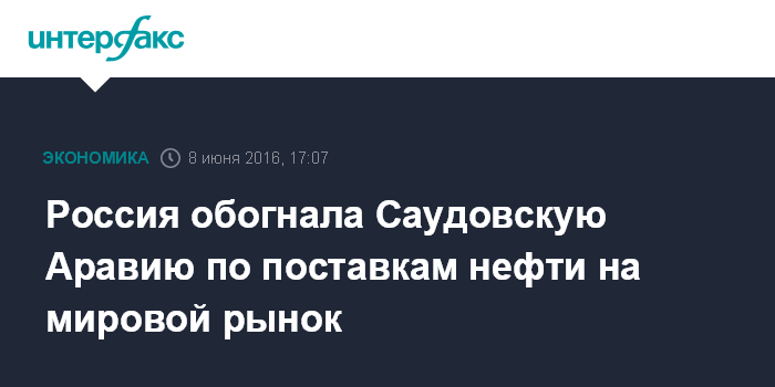 Москва. 8 июня. INTERFAX.RU - Россия в 2015 году обогнала Саудовскую Аравию по объемам поставок нефти на мировой рынок, став крупнейшим экспортером "черного золота", свидетельствуют данные ежегодного статистического обзора, подготовленного BP.