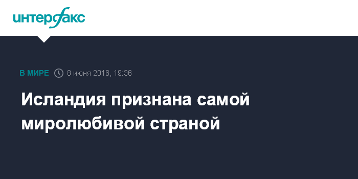 Москва. 8 июня. INTERFAX.RU - Исландия признана самой миролюбивой страной в глобальном индексе миролюбия, опубликованном Институтом экономики и мира в Сиднее (Австралия).