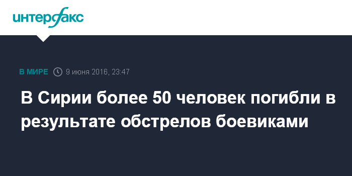 Москва. 9 июня. INTERFAX.RU - В Сирии более 50 человек погибли, почти 100 ранены в минувшие сутки в результате обстрелов группировкой "Джабхат ан-Нусра" ("Джабхат ан-Нусра" - террористическая группировка, деятельность которой запрещена в России) населенных пунктов в ряде провинций, сообщили в Министерстве обороны России.
