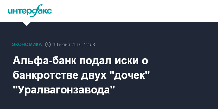 Москва. 10 июня. INTERFAX.RU - Альфа-банк в пятницу подал в Арбитражный суд Челябинской области иски о банкротстве ООО "ЧТЗ-Уралтрак" и ООО "Технопарк "Тракторозаводский" (ТПТ, оба - Челябинск), входящих в состав ОАО "НПК "Уралвагонзавод" (УВЗ).