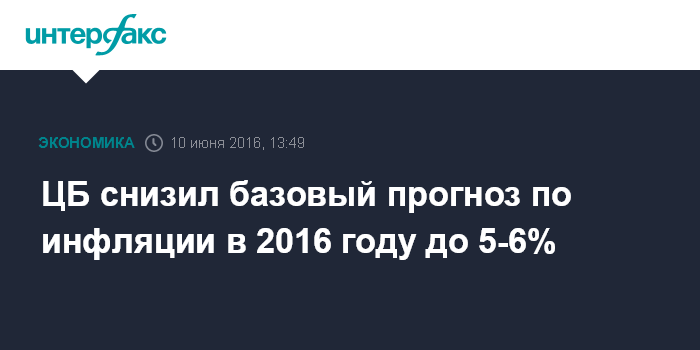 Москва. 10 июня. INTERFAX.RU - Банк России снизил прогноз по инфляции на конец 2016 года до пяти-шести процентов, говорится в заявлении регулятора по итогам заседания совета директоров.