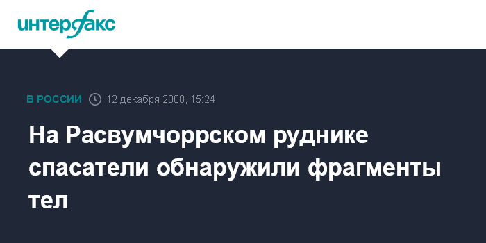 Москва. 12 декабря. INTERFAX.RU - Спасатели, работающие на месте взрыва в Расвумчоррском руднике в Мурманской области, обнаружили фрагменты тел, предположительно, принадлежащие троим горнякам, бывшим в эпицентре взрыва.