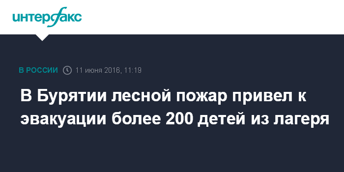 Москва. 11 июня. INTERFAX.RU - Вблизи детского лагеря "Дружба" в Бурятии бушует лесной пожар, более 200 детей будут эвакуированы в Улан-Уде, сообщает в субботу региональное ГУ МЧС.