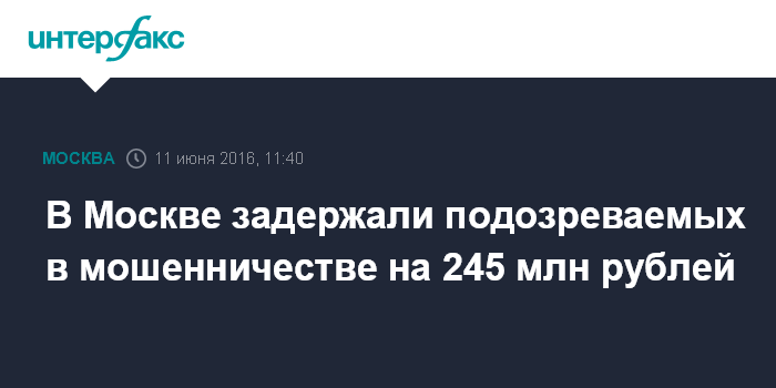 Москва. 11 июня. INTERFAX.RU - В Москве сотрудники полиции задержали двоих подозреваемых в хищении 245 млн руб. под видом оформления кредитных договоров, сообщила в субботу пресс-служба столичного главка МВД.