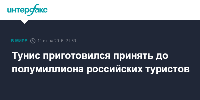 Москва. 11 июня. INTERFAX.RU - Российский турпоток в Тунис в 2016 году может достичь полумиллиона, так как число россиян, посетивших страну с января по май, составило более 74 тыс. и выросло на 650% по сравнению с тем же периодом 2015 года, сообщил журналистам глава Тунисского национального офиса по туризму в России и странах СНГ Межид Кахлауи.