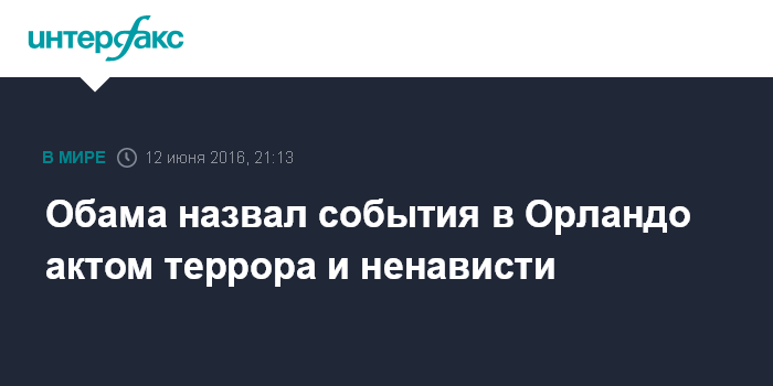 Москва. 12 июня. INTERFAX.RU - Стрельба в ночном клубе в Орландо, в результате которой погибли 50 человек, была актом террора и ненависти, заявил президент США Барак Обама.