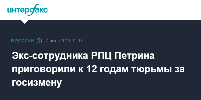Москва. 14 июня. INTERFAX.RU - Мосгорсуд приговорил к 12 годам колонии строгого режима бывшего сотрудника Отдела внешних церковных связей Московского патриархата Евгения Петрина, признанного виновным в государственной измене в пользу США.