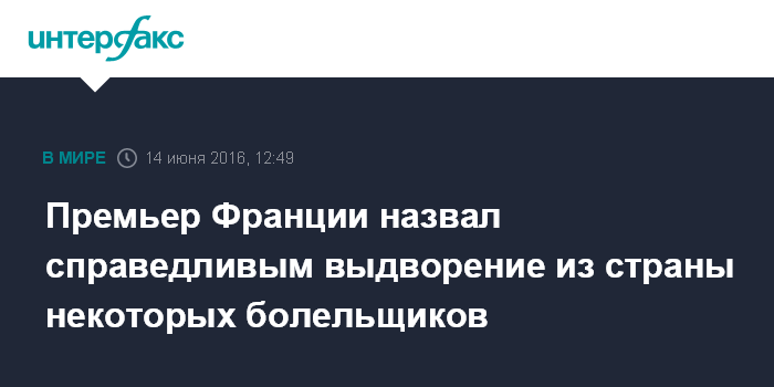 Москва. 14 июня. INTERFAX.RU - Премьер-министр Франции Манюэль Вальс сообщил, что считает справедливым решение выдворить из страны некоторых футбольных болельщиков из-за их поведения.