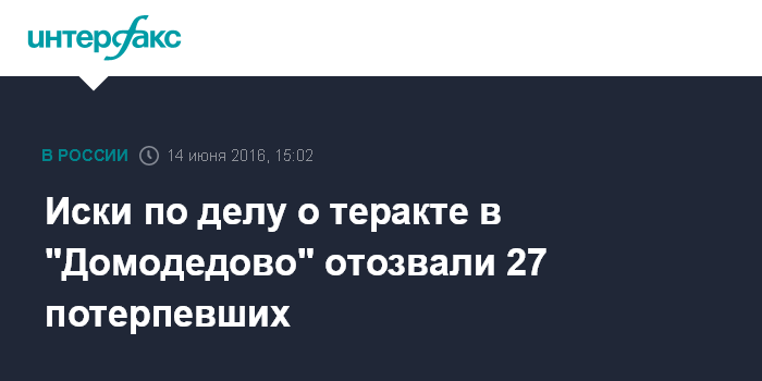 Москва. 14 июня. INTERFAX.RU - Пострадавшие в результате теракта в аэропорту "Домодедово", которые получили выплаты, отозвали свои гражданские иски к руководству аэровокзала.