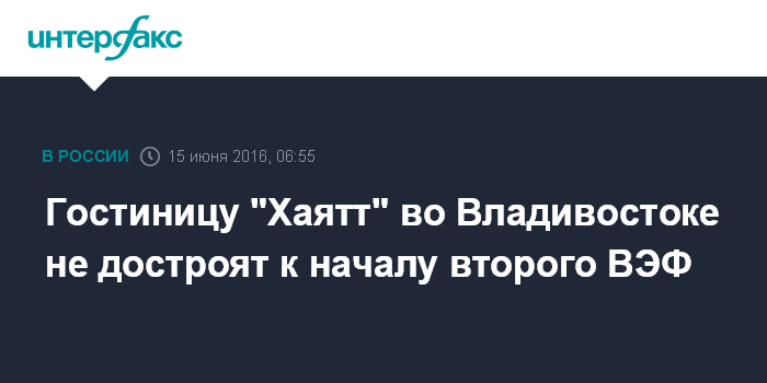 Москва. 15 июня. INTERFAX.RU - Пятизвездочная гостиница "Хаятт", которая должна быть дать как минимум около 100 номеров для гостей второго Восточного экономического форума (ВЭФ) во Владивостоке, к мероприятию достроена не будет.
