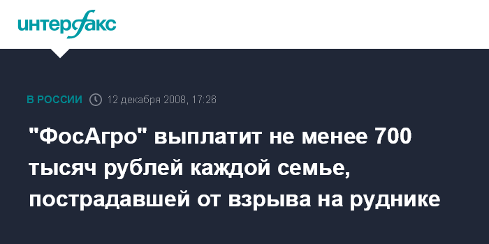 Москва. 12 декабря. INTERFAX.RU - Холдинг "ФосАгро" в ближайшее время примет окончательное решение о размере материальной помощи семьям горняков, погибших и пострадавших при взрыве на Расвумчоррском руднике в Мурманской области.