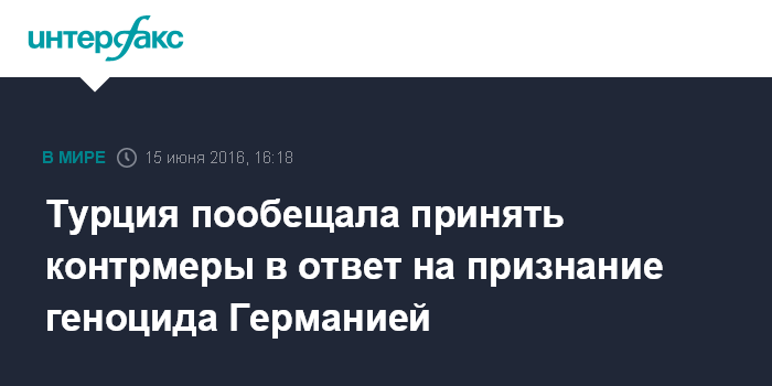 Москва. 15 июня. INTERFAX.RU - Власти Турции обсуждают контрмеры в ответ на признание Бундестагом (германским парламентом) массовых убийств армян в Османской империи геноцидом, сообщил в среду высокопоставленный турецкий чиновник на встрече с зарубежными журналистами, работающими в Стамбуле.