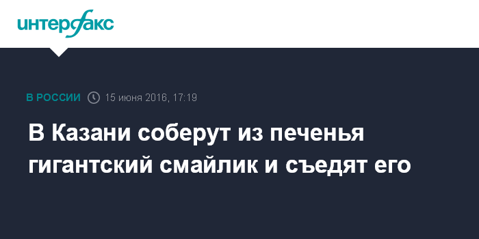 Москва. 15 июня. INTERFAX.RU - Организаторы акции в Казани надеются попасть в "Книгу рекордов России", собрав 25 июня на одной из городских площадей смайлик из разноцветного печенья площадью 90 кв.м.