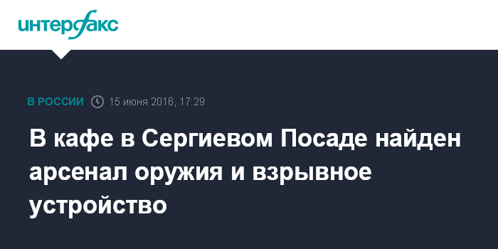 Москва. 15 июня. INTERFAX.RU - В подмосковном Сергиевом Посаде нашли в кафе арсенал оружия и, предположительно, взрывное устройство, сообщила "Интерфаксу" официальный представитель МВД Ирина Волк.