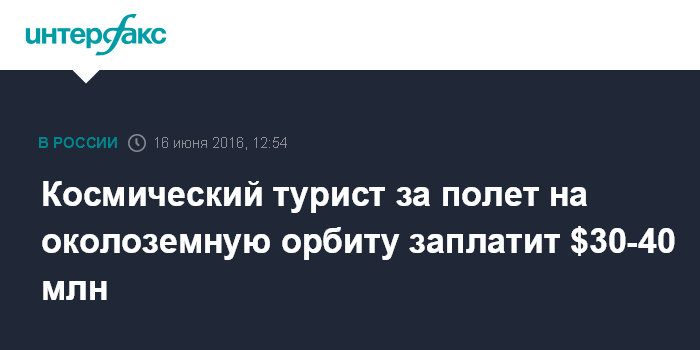 Москва. 16 июня. INTERFAX.RU - Стоимость одного места в полете на низкую околоземную орбиту для космических туристов может составить более $30-40 млн, заявил в интервью телеканалу CNBC глава госкорпорации "Роскосмос" Игорь Комаров.