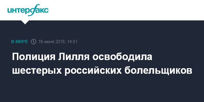 Москва. 16 июня. INTERFAX.RU - Полиция освободила шестерых российских болельщиков, задержанных накануне в Лилле, сообщил в четверг пресс-атташе посольства РФ во Франции Сергей Паринов.
