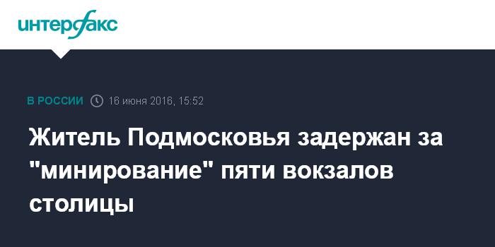 Москва. 16 июня. INTERFAX.RU - За ложное сообщение о бомбах на пяти московских железнодорожных вокзалах задержан 39-летний житель Подмосковья, сообщила "Интерфаксу" официальный представитель МВД России Ирина Волк.