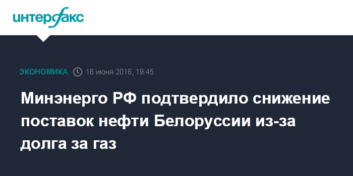 Москва. 16 июня. INTERFAX.RU - Минэнерго России признало, что российская сторона сокращает поставки нефти в Белоруссию в связи с долгами за российский газ.