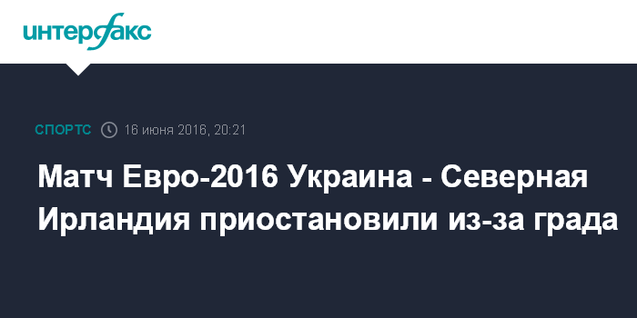 Москва. 16 июня. INTERFAX.RU - Бригада арбитров, обсуживающая матч чемпионата Европы между сборными Украины и Северной Ирландии, была вынуждена прервать игру из-за града.