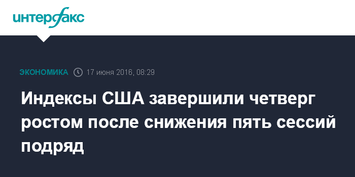 Москва. 17 июня. INTERFAX.RU - Американские фондовые индексы завершили торги в четверг "в плюсе" после снижения по итогам пяти сессий подряд, сообщает MarketWatch.
