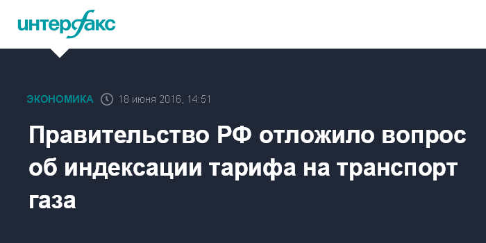 Москва. 18 июня. INTERFAX.RU - Правительство РФ решило отложить на несколько месяцев вопрос об индексации тарифа на транспортировку газа для независимых производителей, заявил в интервью телеканалу "Россия 24" вице-премьер РФ Аркадий Дворкович.