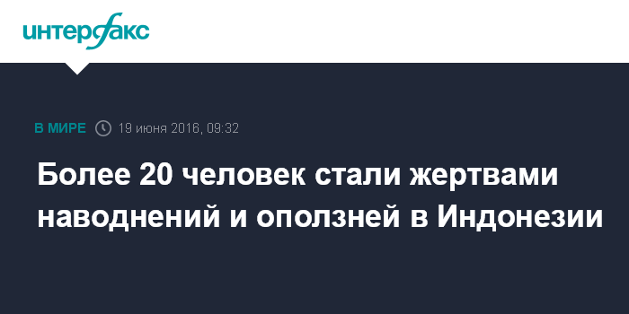 Москва. 19 июня. INTERFAX.RU - Ливневые паводки и оползни привели к гибели 24 человек в Индонезии, сообщили в воскресенье власти страны. Еще не менее 26 считаются пропавшими без вести.