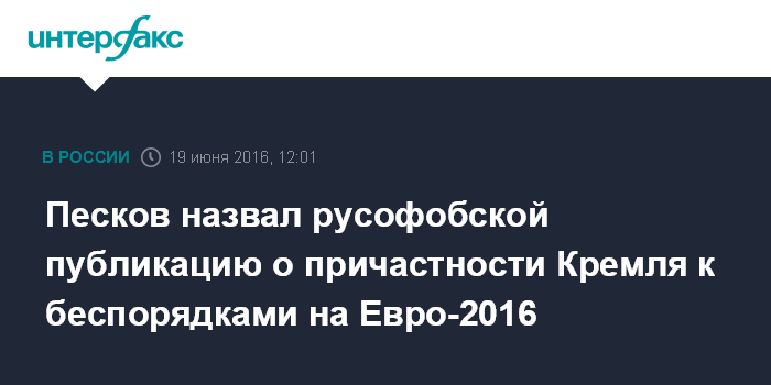 Песков назвал русофобской публикацию о причастности Кремля к беспорядками на Евро-2016