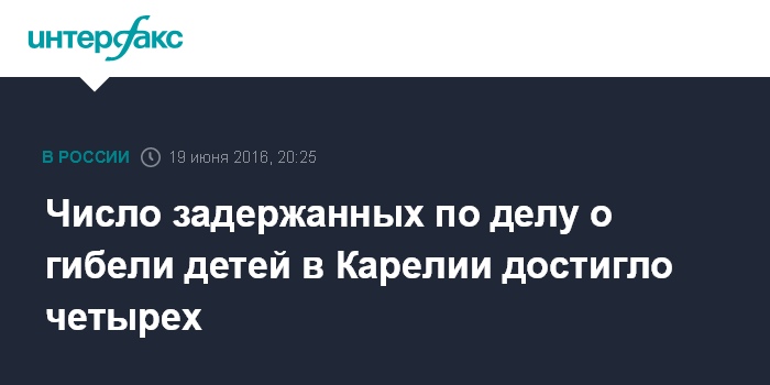 Москва. 19 июня. INTERFAX.RU - В Карелии задержано четверо подозреваемых, возможно причастных к трагедии на Сямозере, сообщил "Интерфаксу" официальный представитель СКР Владимир Маркин.