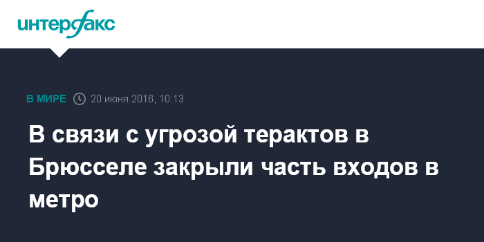 Москва. 20 июня. INTERFAX.RU - Некоторые входы на шести станциях метро Брюсселя будут закрыты на неопределенное время по требованию полиции в связи с террористической угрозой, выявленной в последние дни, сообщили бельгийские СМИ.