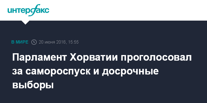 Москва. 20 июня. INTERFAX.RU - Хорватские депутаты в понедельник проголосовали за то, чтобы распустить парламент и провести досрочные выборы, сообщили западные СМИ.