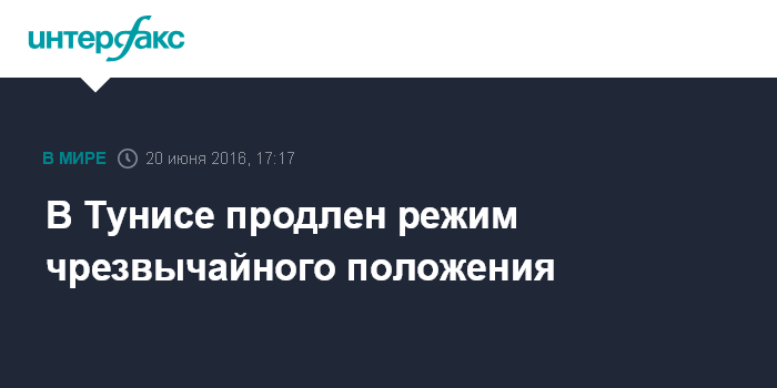 Москва. 20 июня. INTERFAX.RU - Президент Туниса принял решение еще на месяц продлить режим чрезвычайного положения, который был введен в ноябре прошлого года, когда страна пережила серию терактов.
