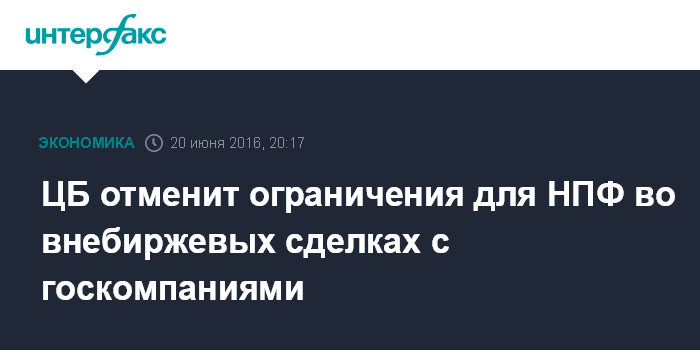 Москва. 20 июня. INTERFAX.RU - ЦБ РФ снял ограничения для инвестирования негосударственными пенсионными фондами (НПФ) средств пенсионных накоплений в акции госкомпаний, реализуемые в рамках внебиржевых приватизационных сделок с участием агентов.