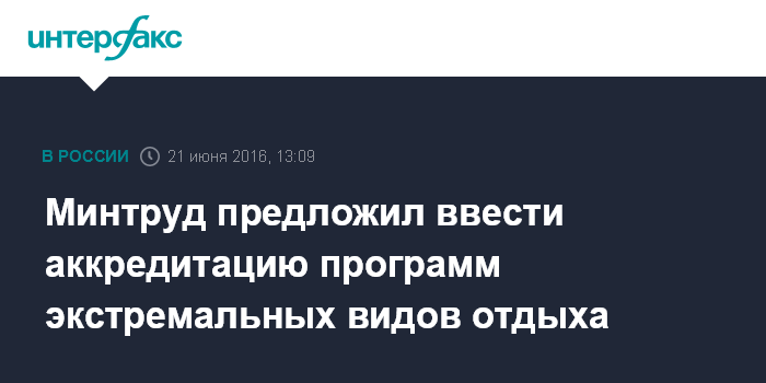 Москва. 21 июня. INTERFAX.RU - Минтруд РФ в связи с трагедией в Карелии предложит ввести обязательную аккредитацию программ для экстремальных видов отдыха, заявил глава ведомства Максим Топилин.