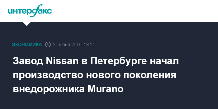 Москва. 21 июня. INTERFAX.RU - Санкт-Петербургский завод Nissan во вторник начал серийное производство нового поколения внедорожника Murano, сообщил корреспондент "Интерфакса" с торжественной церемонии пуска производства.