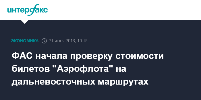 Москва. 21 июня. INTERFAX.RU - Федеральная антимонопольная служба (ФАС) РФ проводит проверку обоснованности стоимости билетов "Аэрофлота" на дальневосточных маршрутах.