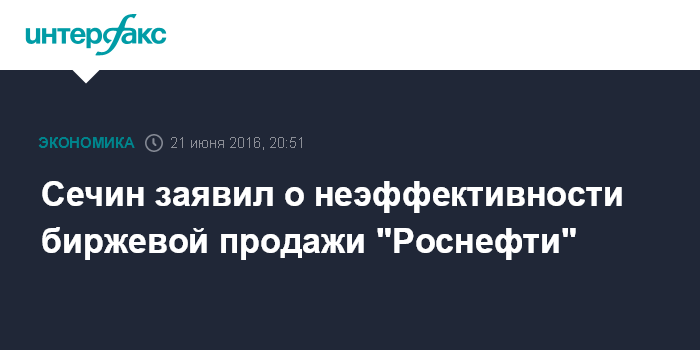 Москва. 21 июня. INTERFAX.RU - Биржевая продажа "Роснефти" в рамках планируемой приватизации пакета акций НК крайне неэффективна и может обернуться срывом. Такое мнение высказал глава компании Игорь Сечин в интервью телеканалу "Россия-24".